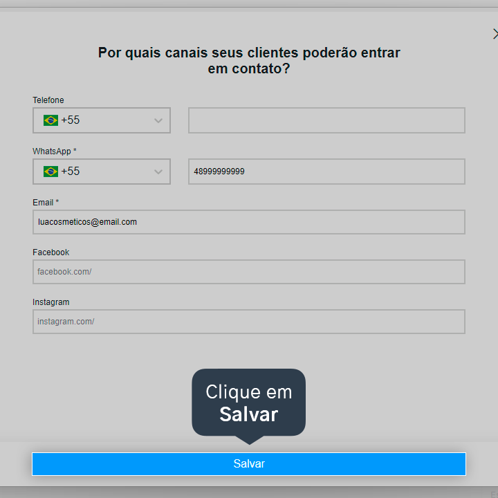 Pronto! Você aprendeu a adicionar os canais da sua loja, onde seus clientes poderão entrar em contato com você, no seu Catálogo online.