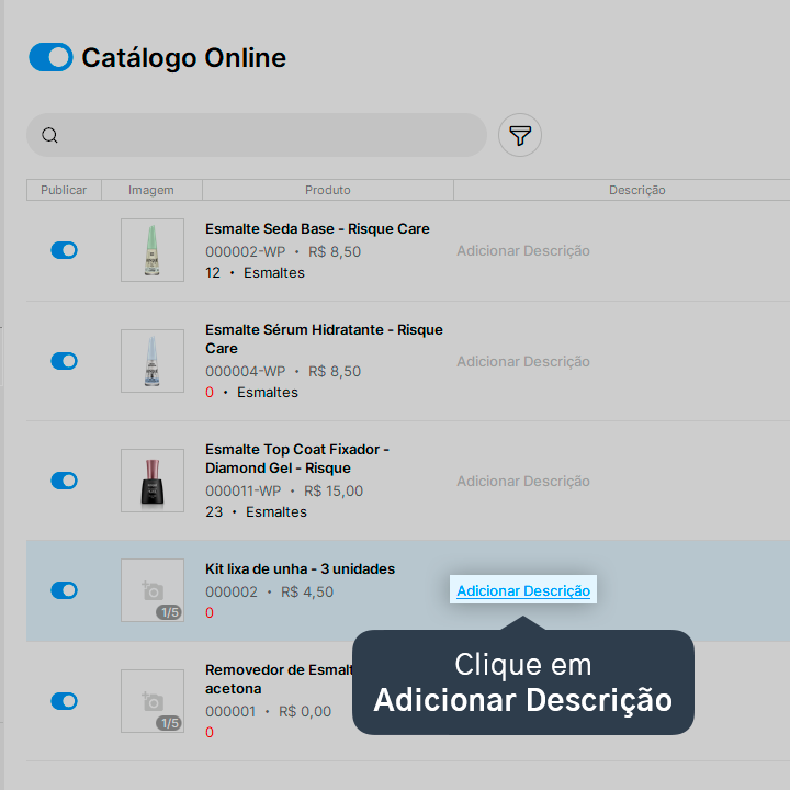 2. Identifique o produto desejado e clique em Adicionar Descrição.