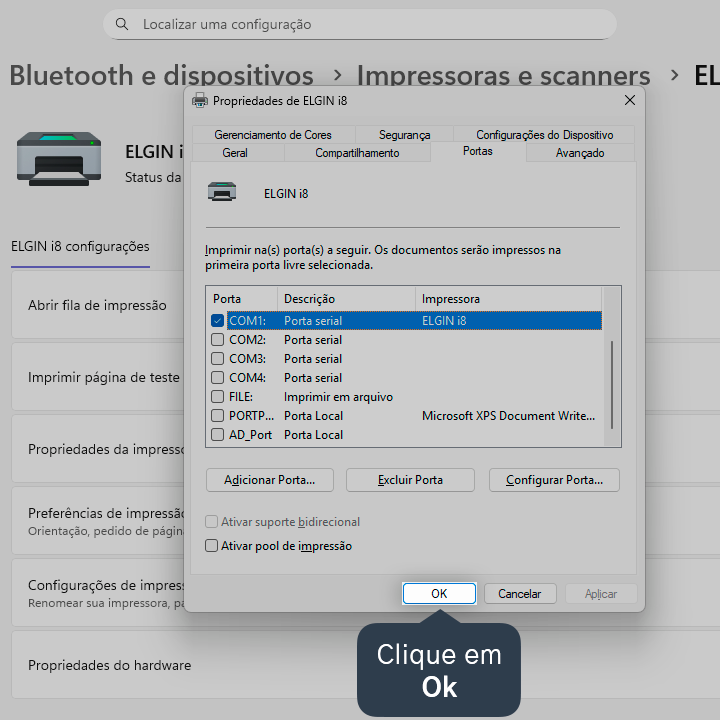 Pronto! A configuração de porta de entrada foi alterada no driver da impressora.