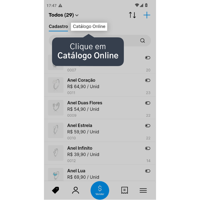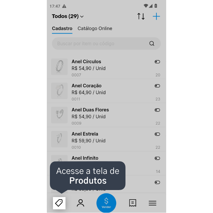 1. Acesse a tela de Produtos, clicando no ícone de tag no menu inferior esquerdo.