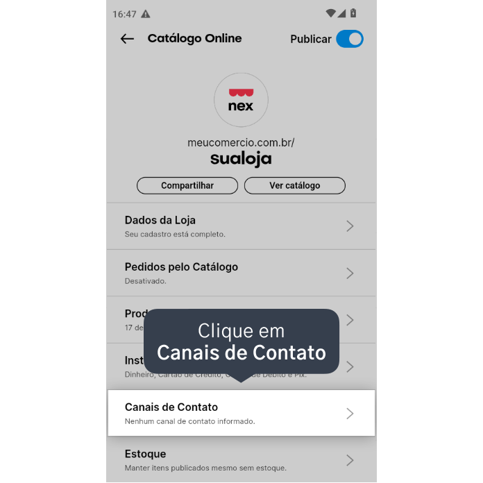 Veja como adicionar os canais de contato da sua loja no Catálogo online, utilizando o aplicativo de vendas do Nex.