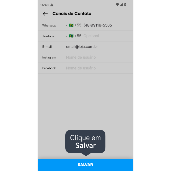Pronto! Seus canais de contato foram atualizados com as informações preenchidas e aparecerão para seus clientes no seu Catálogo online.