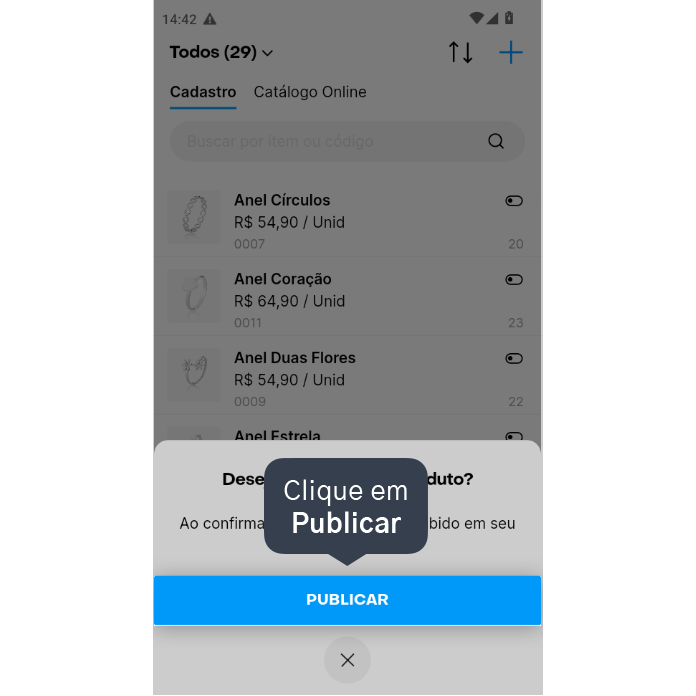 11. Identifique o produto que deseja publicar e, em seguida, clique no botão ao lado direito.