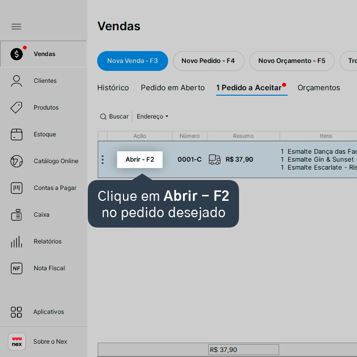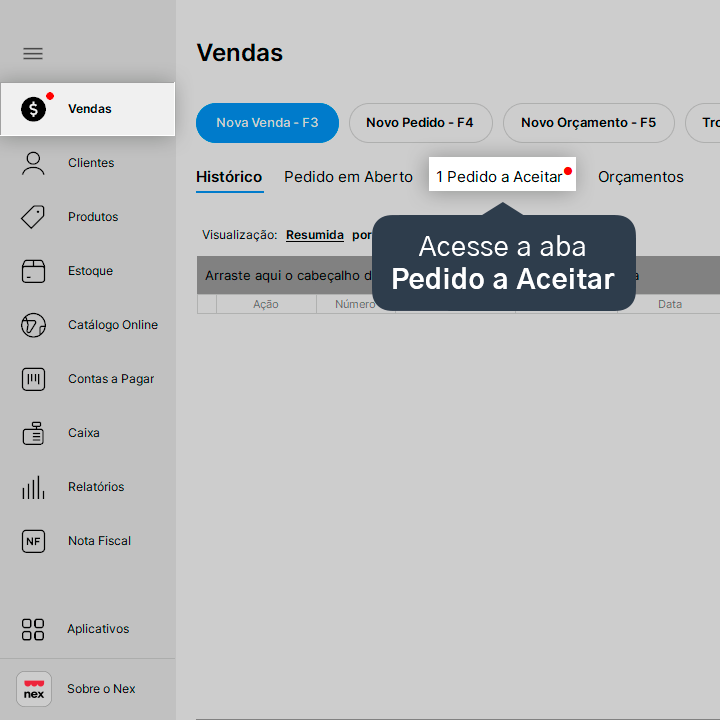 1. Na tela de Vendas, acesse a aba Pedido a Aceitar.