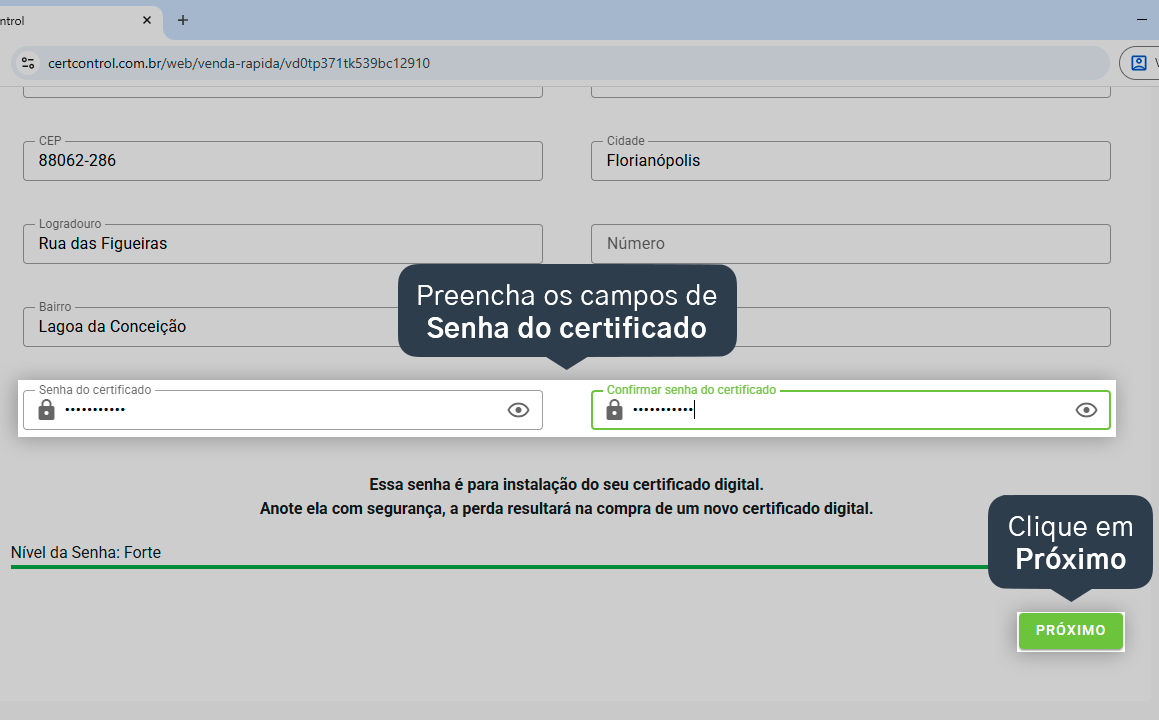 6. Preencha os campos de Senha do certificado e, em seguida, clique em Próximo.