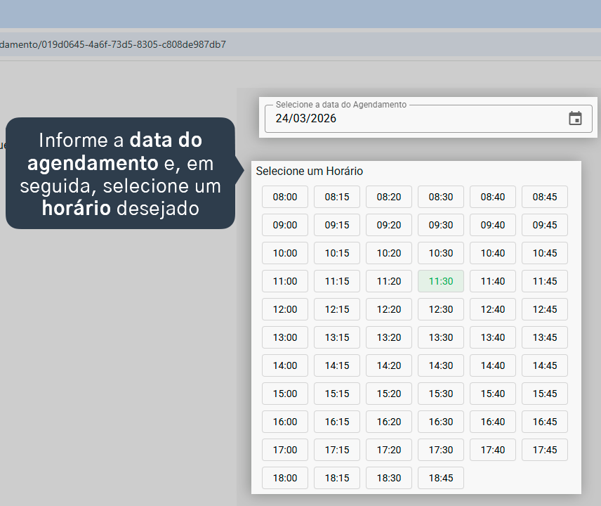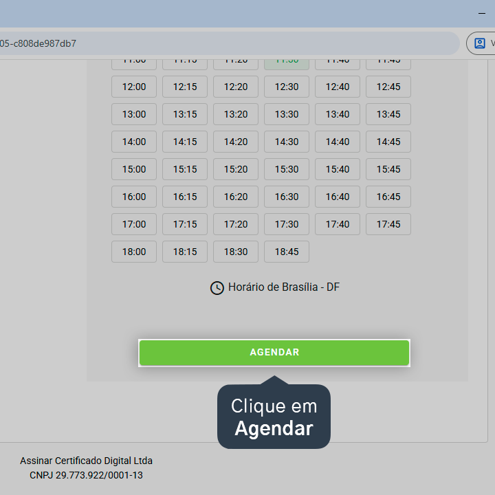 11. Para a validação do Certificado Digital, será necessário realizar uma videoconferência com a Tecnosign. Informe a data do agendamento e, em seguida, selecione um horário desejado.