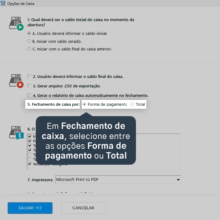 Veja como alterar o modo de fechamento do caixa, entre valor total e por meio de pagamento.