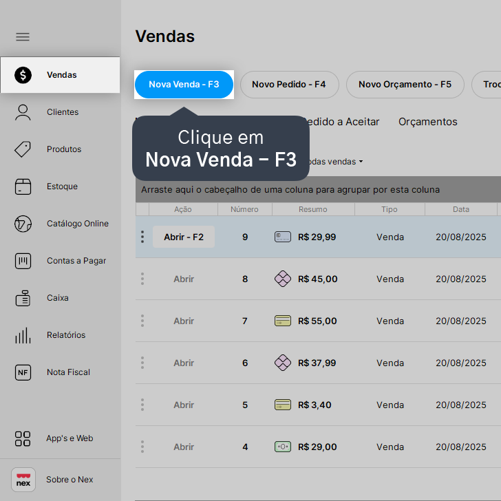 1. Na tela de Vendas, clique em Nova Venda - F3.
