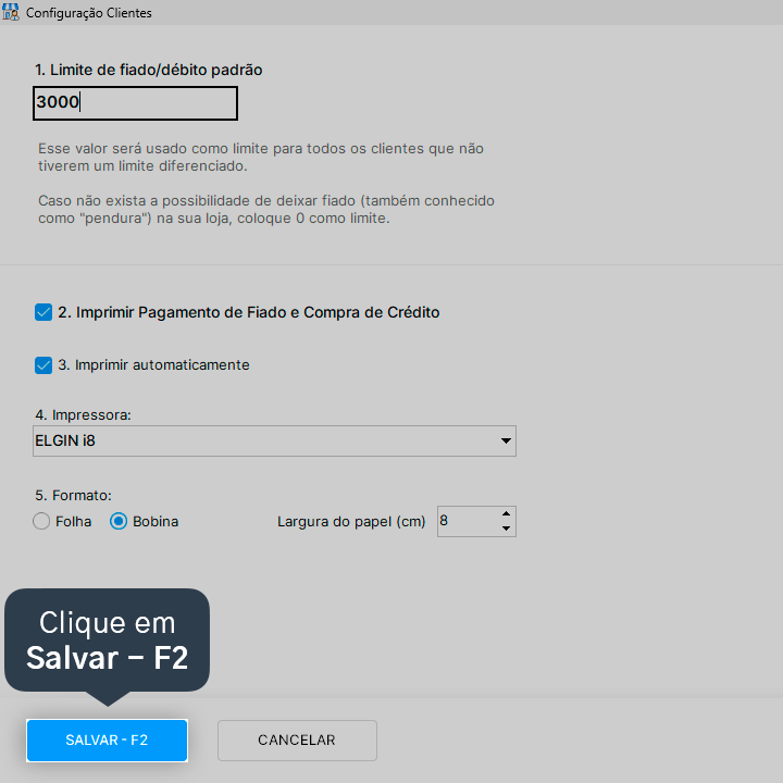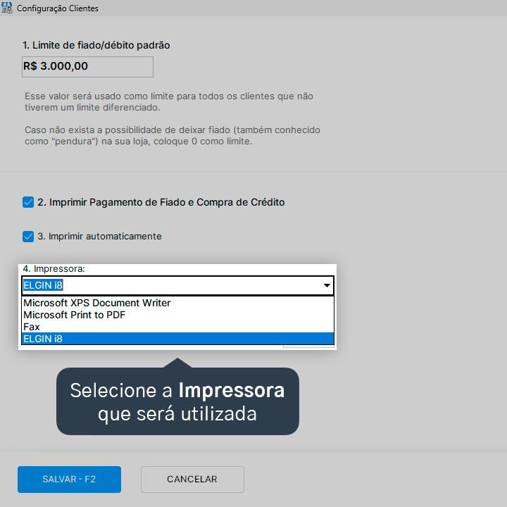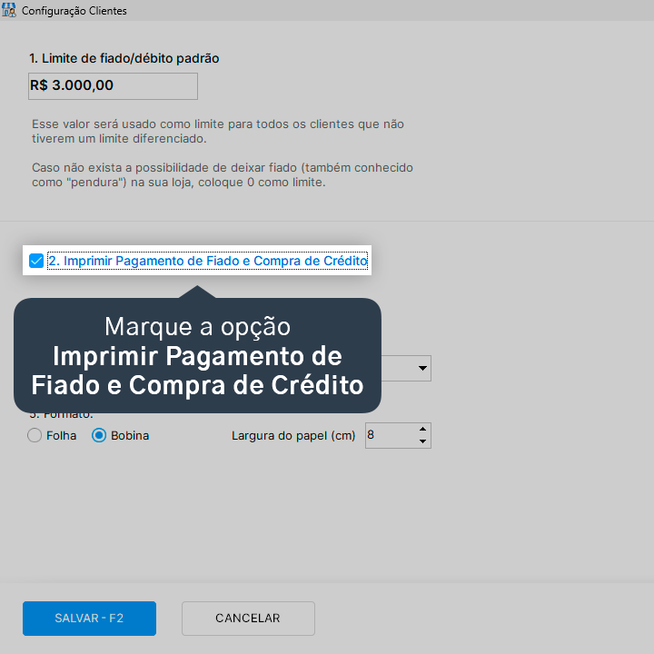 3. Marque a opção Imprimir Pagamento de Fiado e Compra de Crédito.