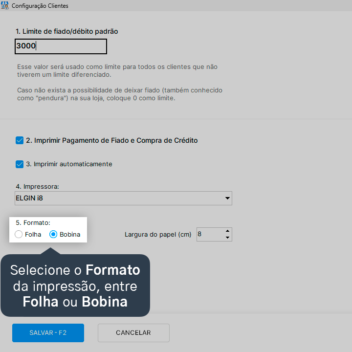 5. Selecione o Formato da impressão, entre Folha ou Bobina.
