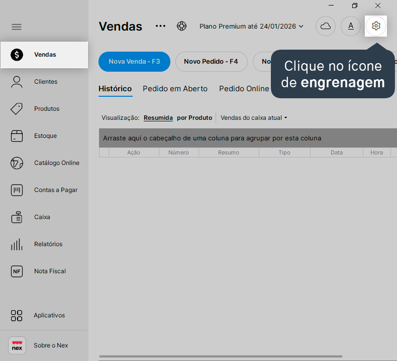 1. Na tela de Vendas, clique no ícone de engrenagem, no canto superior direito.