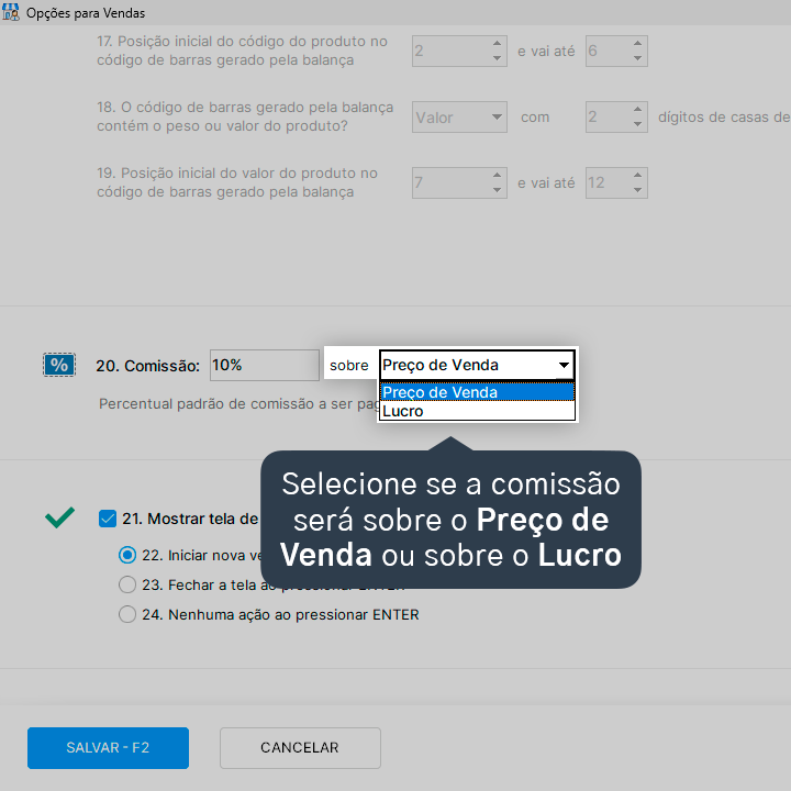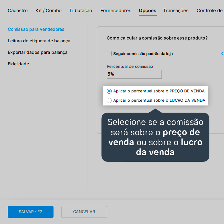 4. Selecione se a comissão será aplicada sobre o preço de venda ou sobre o lucro da venda.
