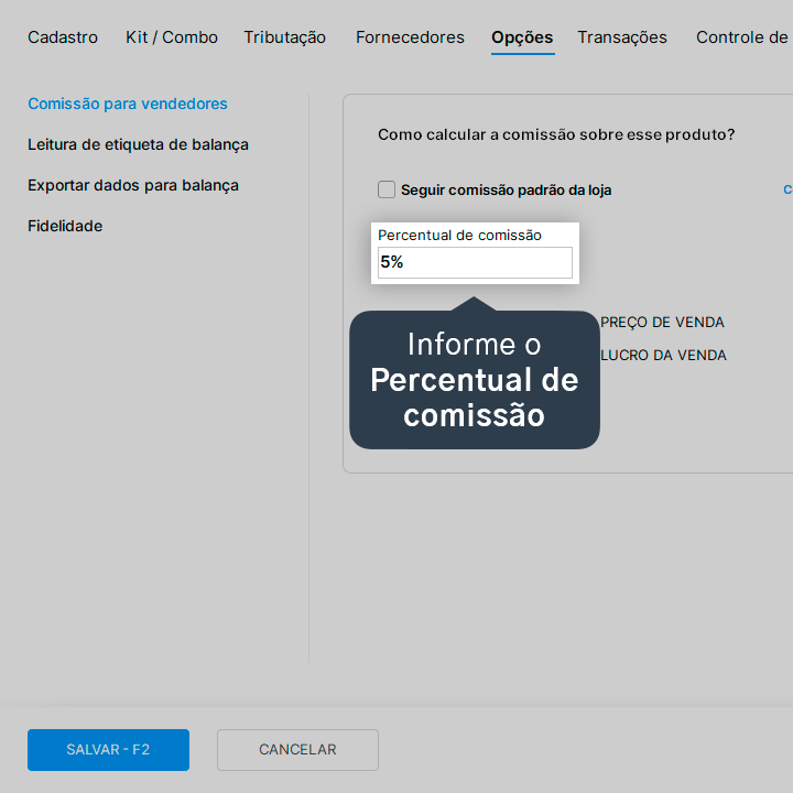 2. Na opção Comissão, informe o percentual da comissão de venda.