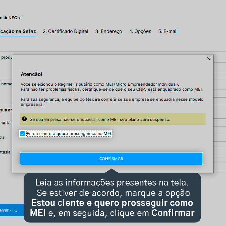 Pronto! Agora o seu Nex está configurado para a emissão de NFC-e, sendo MEI - Micro empreendedor Individual.