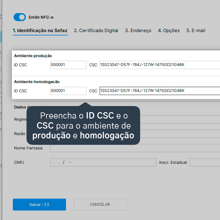 5. Preencha o ID CSC e o CSC para o ambiente de produção e de homologação, de acordo com seu credenciamento com a Secretaria da Fazenda (Sefaz).