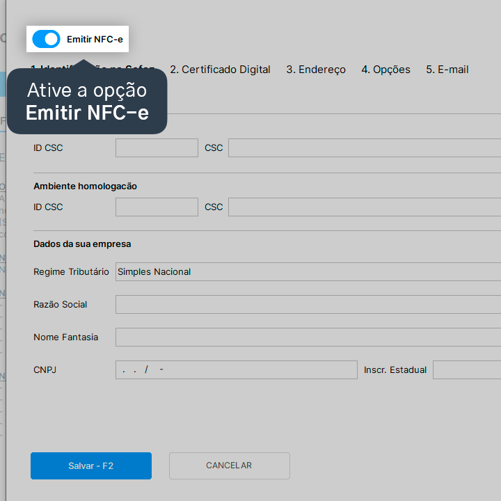 3. Acesse a aba NFC-e e, em seguida, clique em Ativar emissão de NFC-e.
