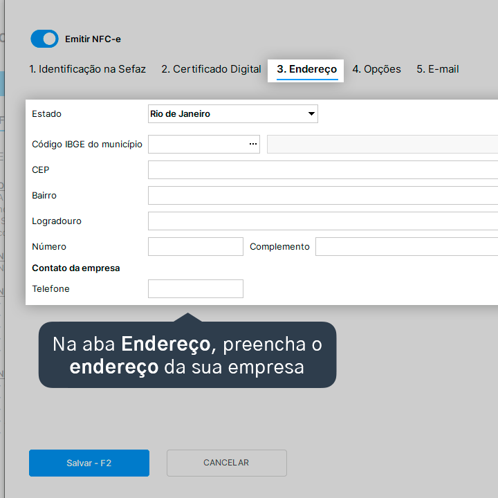 10. Na aba Endereço, preencha o endereço da sua empresa conforme o credenciamento com a Secretaria da Fazenda (Sefaz).