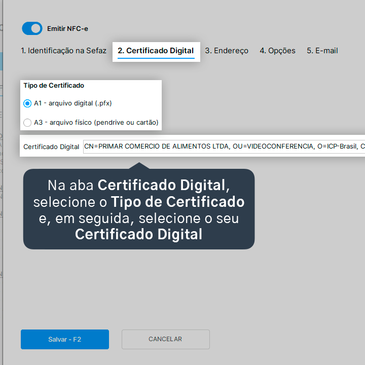 9. Na aba Certificado Digital, selecione o Tipo de Certificado e, em seguida, selecione o seu Certificado Digital.