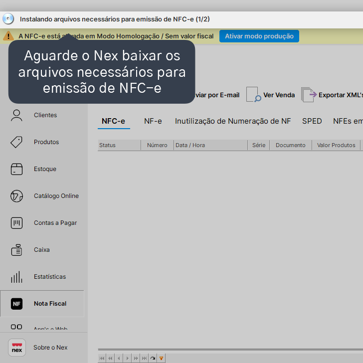 14. Aguarde o Nex baixar os arquivos necessários para emissão de NFC-e.