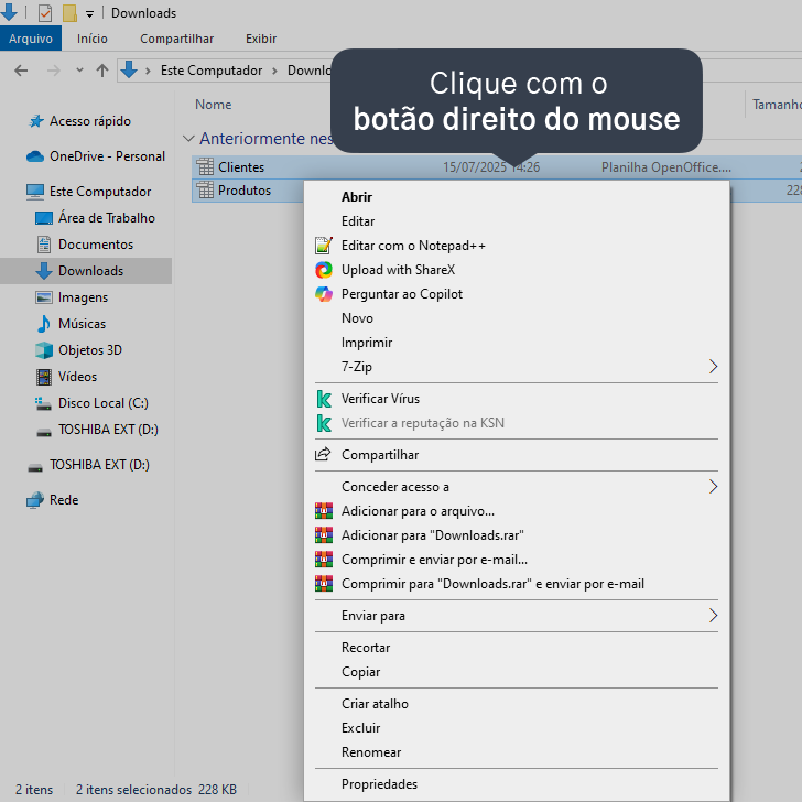 2. Clique com o botão direito do mouse em cima de um dos arquivos.