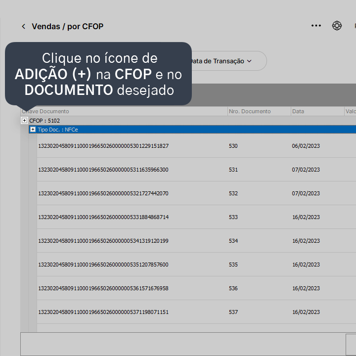 4. Clique no ícone de adição (+) na CFOP e no documento desejado para ampliar as informações.