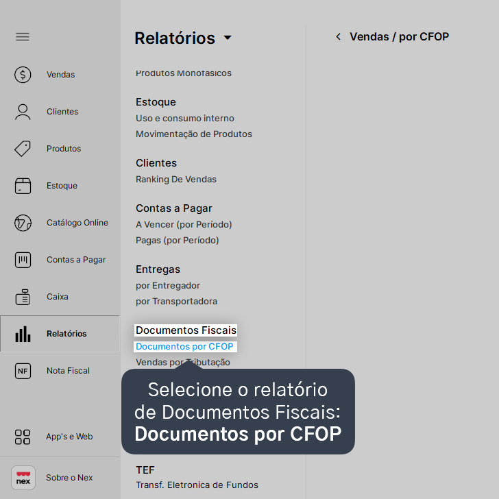2. Selecione o relatório de Documentos Fiscais: Documentos por CFOP.