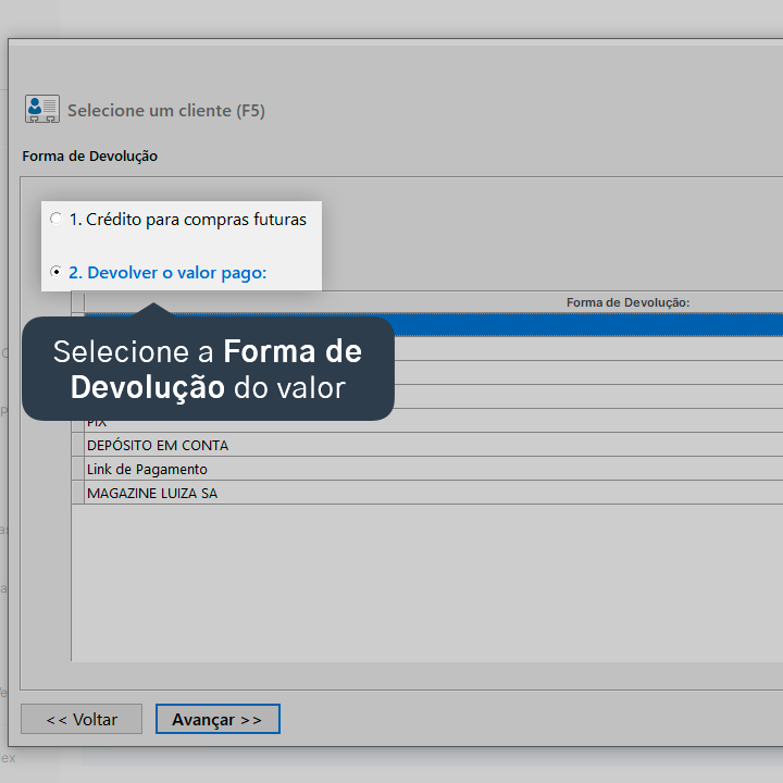 6. Selecione a Forma de Devolução do valor.