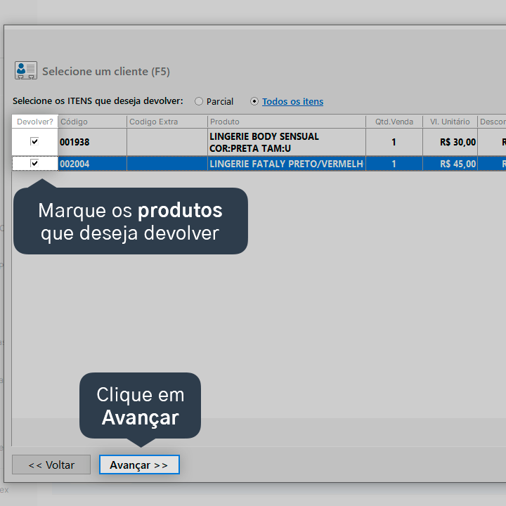 5. Marque os produtos que serão devolvidos e, em seguida, clique em Avançar.
