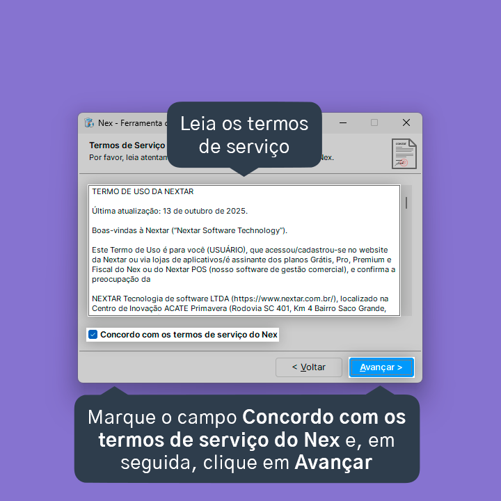 4. Leia atentamente os termos de uso do Nex. Caso concorde, marque o campo Concordo com os termos de serviço do Nex e, em seguida, clique em Avançar.