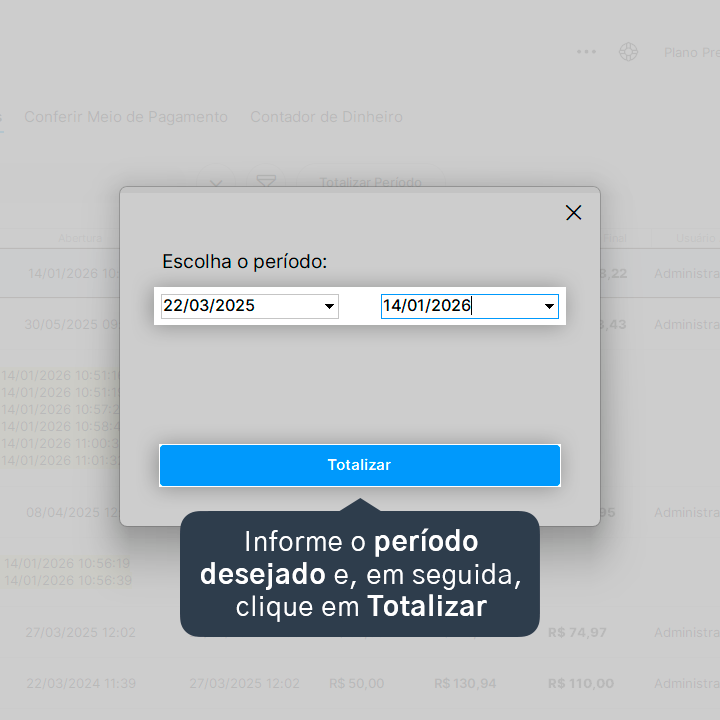 2. Acesse a aba Caixas Anteriores e, em seguida, clique em Totalizar Período.