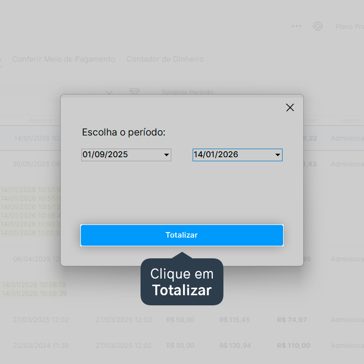 4. Clique nos ícones de setas e selecione as datas para totalização dos caixas.