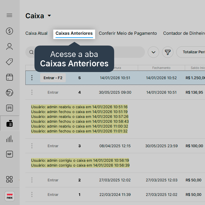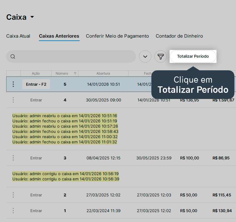 Pronto! Agora você pode verificar o relatório de informações dos caixas anteriores, totalizado com base no período escolhido.