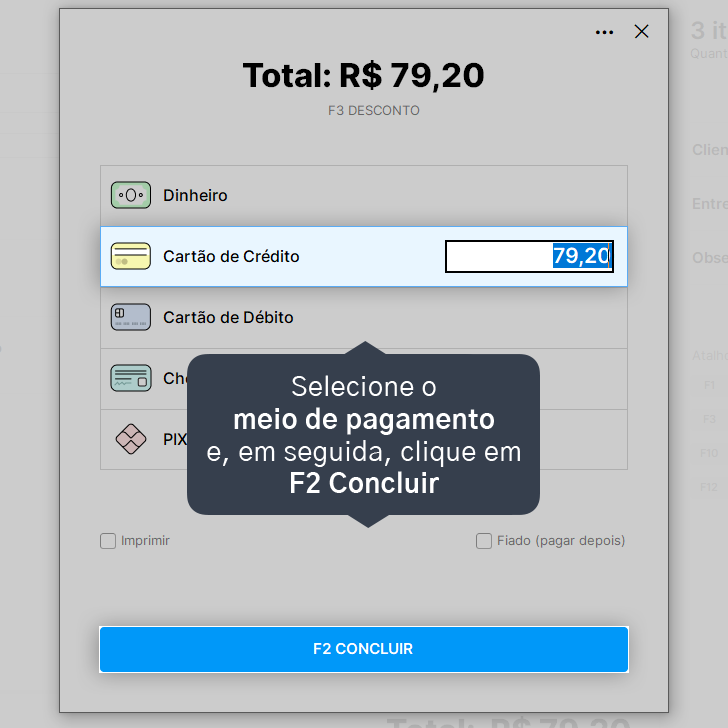 2.7. Informe o meio de pagamento e, em seguida, clique em F2 Concluir.