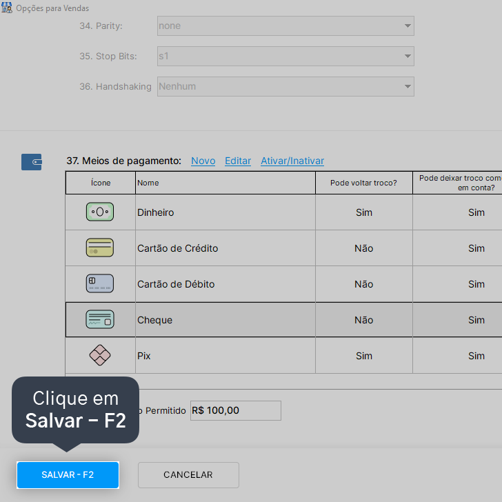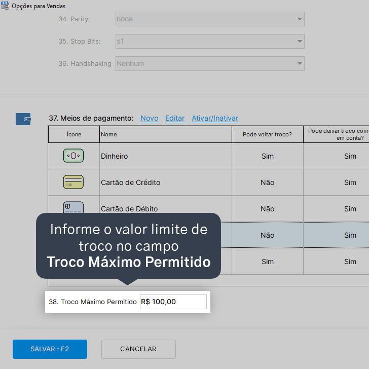 2. Informe o valor limite de troco na opção Troco Máximo Permitido.