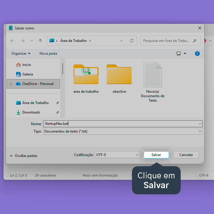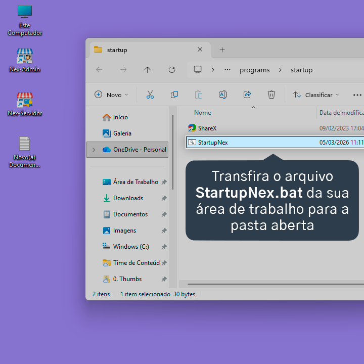 12. Transfira o arquivo StartupNex.bat da sua área de trabalho para a pasta de arquivos para inicialização.