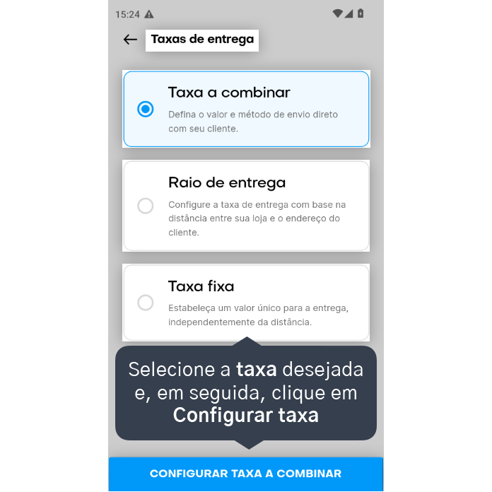 6. Selecione o tipo de taxa desejada, e, em seguida, clique em Configurar taxa. Você pode escolher entre Taxa a combinar, configurar taxa por Raio de entrega ou configurar uma Taxa fixa.