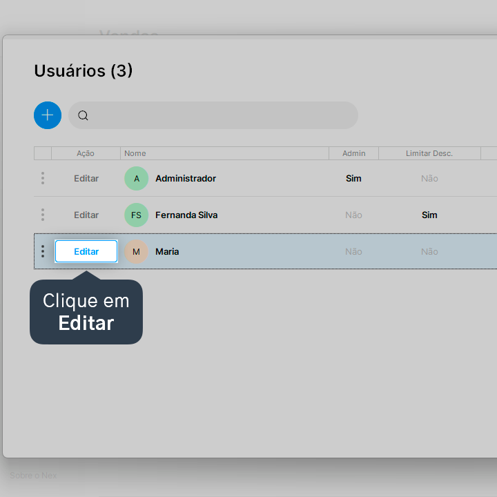 9. Na tela de Usuários, entre no cadastro do usuário que você deseja bloquear a permissão para dar descontos e/ou para excluir itens lançados na venda.
