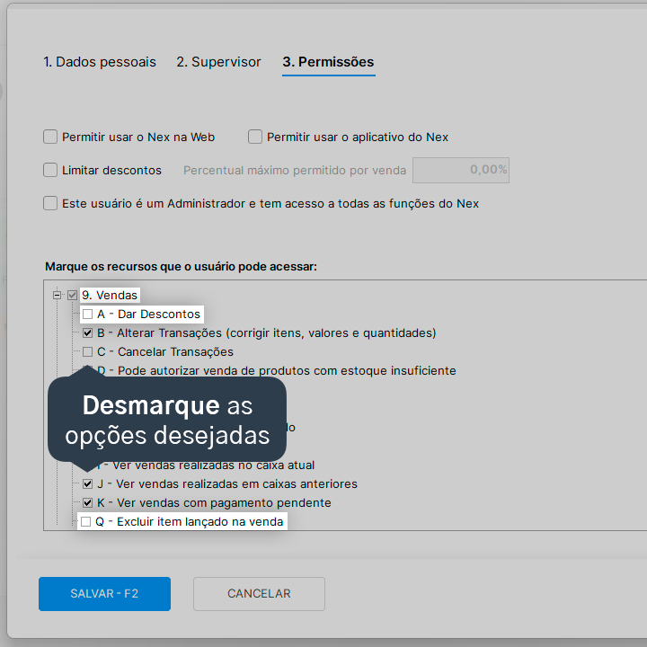 11. Nas permissões de Vendas, deixe a opção A - Dar Descontos desmarcada, para bloquear a permissão de dar desconto; e/ou deixe a opção Q - Excluir item lançado na venda desmarcada, para bloquear a permissão de excluir itens já lançados na tela de venda caixa.