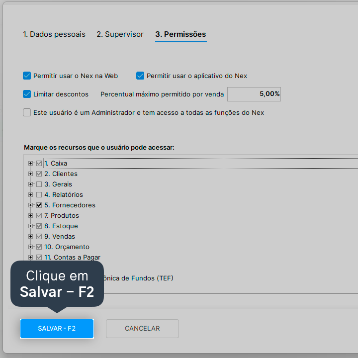 9. Se necessário, acesse a aba de Permissões e configure o que o usuário poderá ou não acessar.