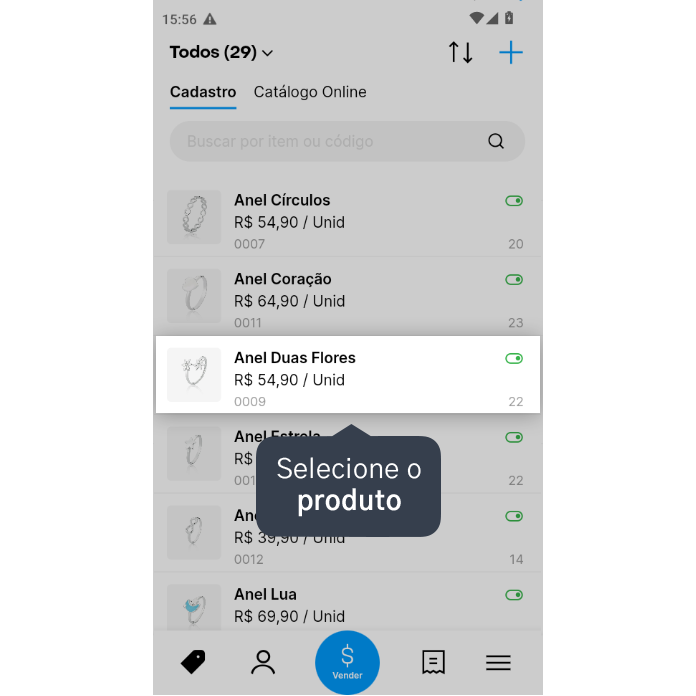 1. Acesse a tela de Produtos, clicando no ícone de tag no menu inferior esquerdo.