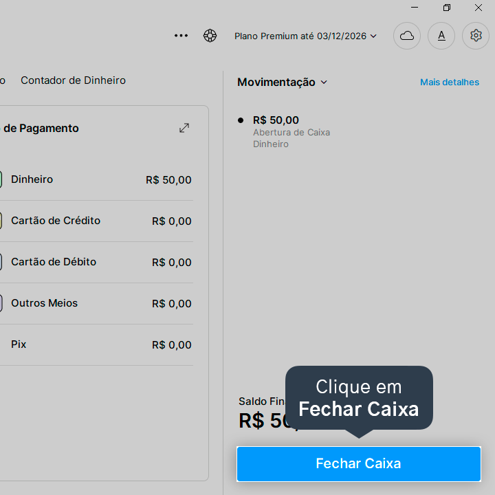 2. Se tiver um caixa aberto, clique em Fechar Caixa e conclua o fechamento do caixa.