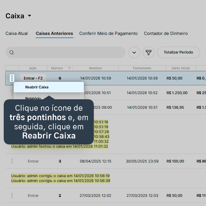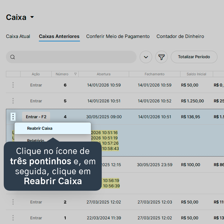 5. Clique no ícone de três pontinhos (...) e, em seguida, clique em Reabrir Caixa.