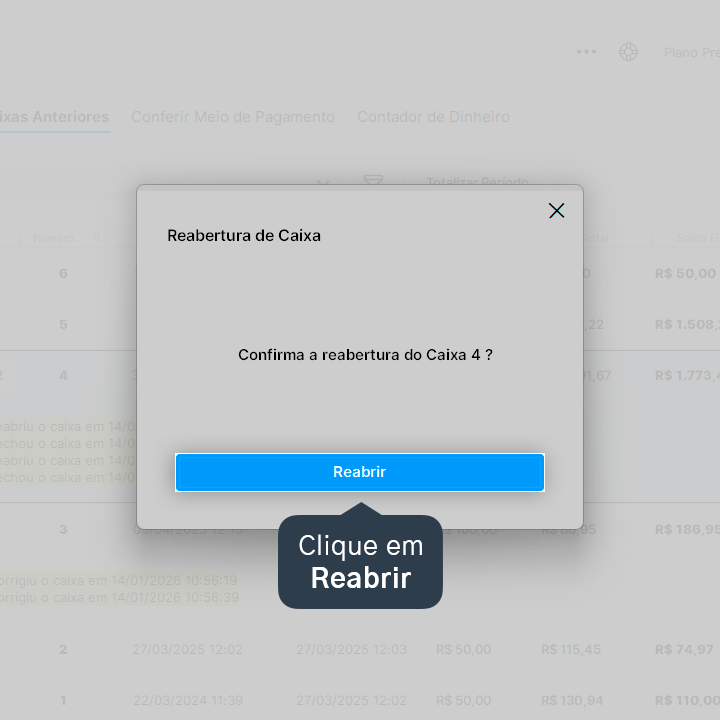 12. No caixa do dia, clique novamente no ícone de três pontinhos (...) e, em seguida, clique em Reabrir Caixa para voltar a lançar as transações do dia.