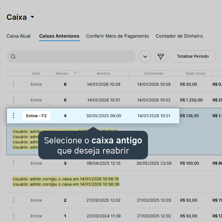 4. Selecione o caixa antigo no qual foi registrada a transação que precisa ser editada ou cancelada.