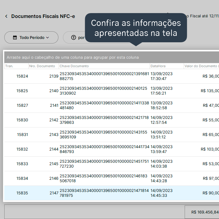 Este relatório reúne as informações das NFC-e emitidas no período selecionado. Por meio dele, é possível consultar dados como o número da transação, número do documento, chave da NFC-e, data e hora de emissão, valor do documento, status da nota (caso tenha sido cancelada) e o valor correspondente ao cancelamento, quando houver.
