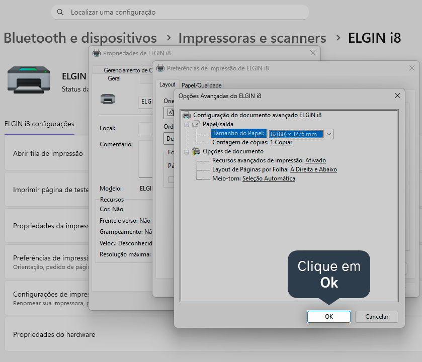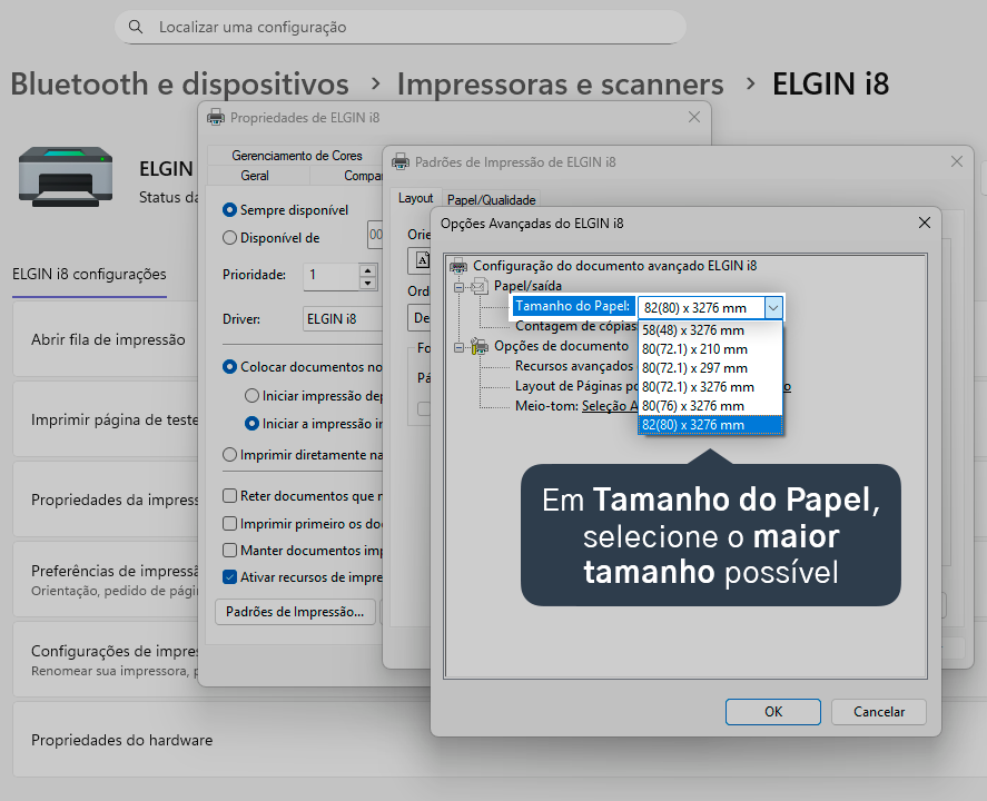 13. Na opção Tamanho do Papel, selecione o maior tamanho possível novamente.