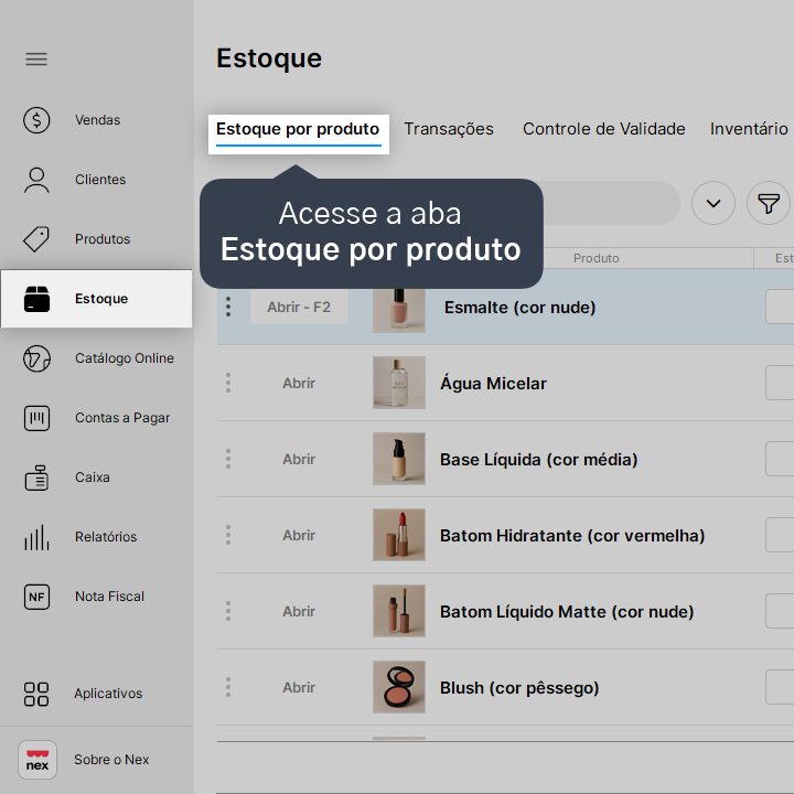 1. Na tela de Estoque, acesse a aba Estoque por produto.