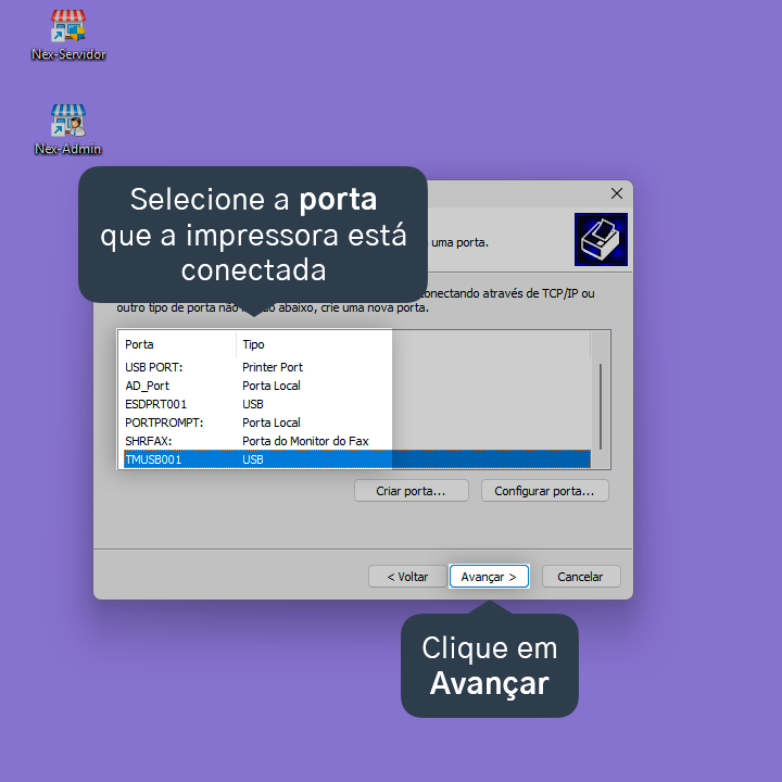 9. Selecione a porta que a impressora está conectada e, em seguida, clique em Avançar.