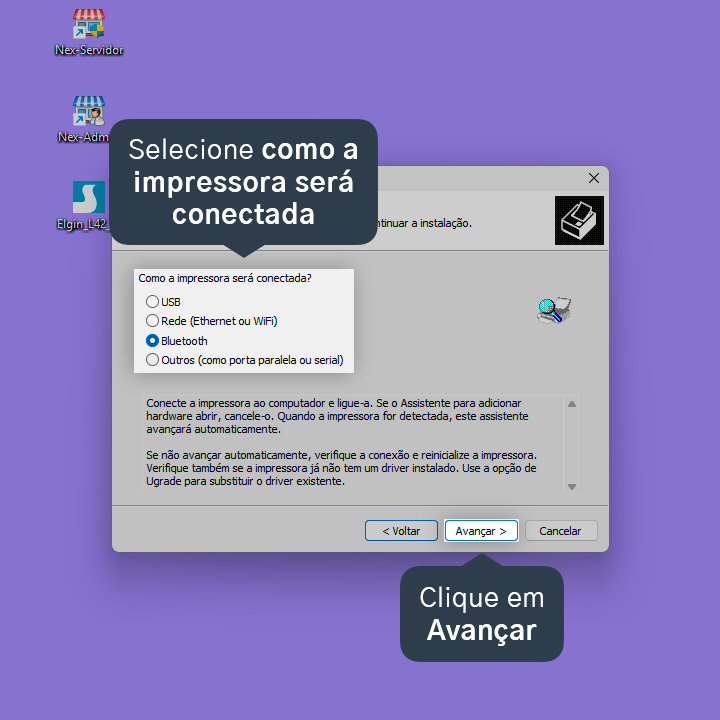 7. Selecione a forma como a impressora será conectada e, em seguida, clique em Avançar.