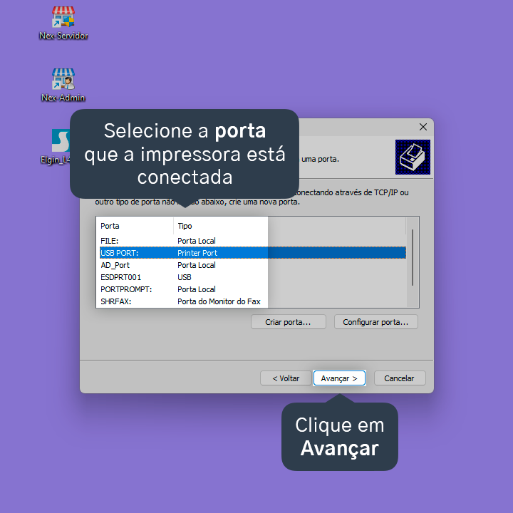 9. Selecione a porta que a impressora está conectada e, em seguida, clique em Avançar.